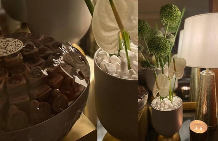• طاولة المنتصف: عدد ١فازة ورد طبيعي ، عدد ٢ شموع ، عدد ٢مكسرات)