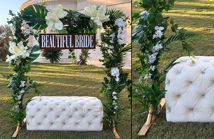 - خلفية مربعة من الخشب ومزينة بالورد الصناعي بلون الاوفوايت مع بنش للجلوس.