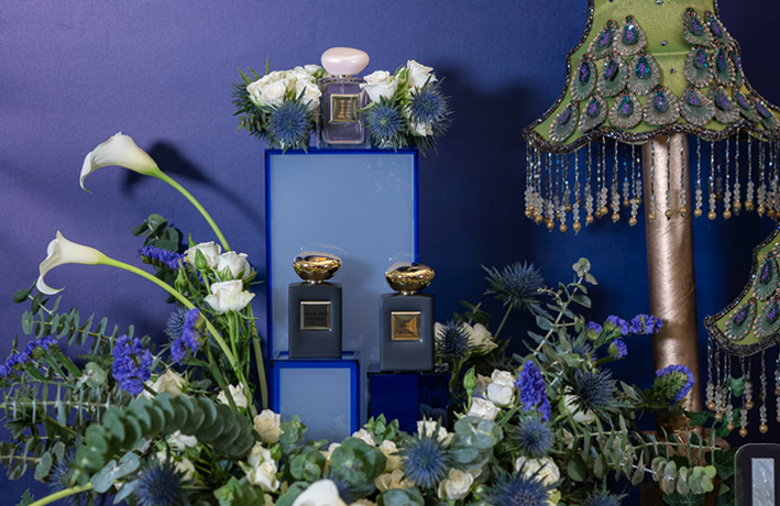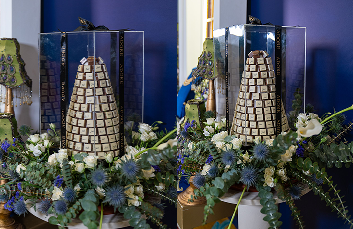 • طاولة مصنوعة من الخشب مغطاة بالمخمل الأزرق.