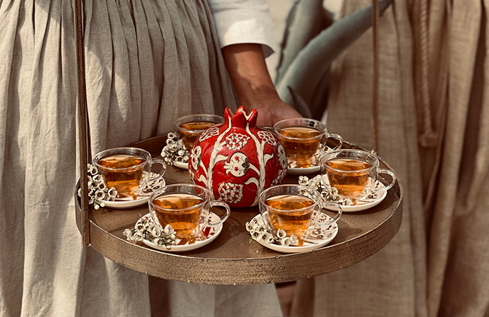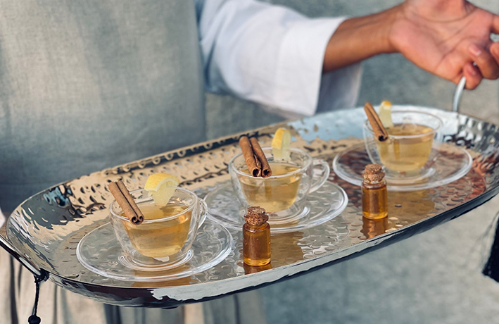 • عدد ٤ أنواع شاي: أسود بالهيل والزعفران والورد الدمشقي (يقدم مع منقوع الزعفران وقطع الورد الدمشقي) ، أخضر مع ورد الياسمين ، زنجبيل وليمون (يقدم مع قطع الليمون ، أعواد دارسين ، وقراش العسل الميني) ، شاي مغربي يقدم مع الأبريق والأكواب المغربية .