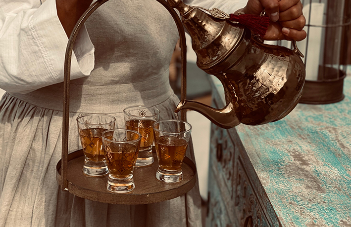 • عدد ٤ أنواع شاي: أسود بالهيل والزعفران ( يقدم مع منقوع الزعفران)، أخضر مع ورد الياسمين ، كركديه ، شاي مغربي يقدم مع الأبريق والأكواب المغربية .