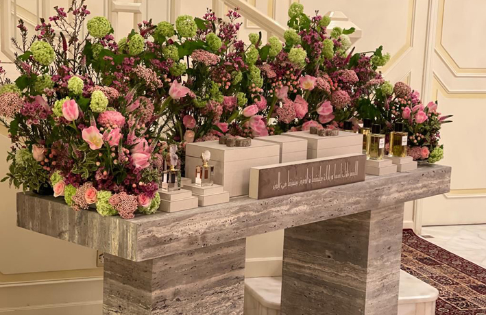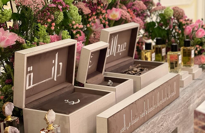 • صناديق خشبية مغطاة بالجلد ومكسوة من الداخل بالشمواه ، مطرزة بالدعاء وأحرف المعاريس ، ويتم تنسيقها بالورد الطبيعي حسب اختياركم.