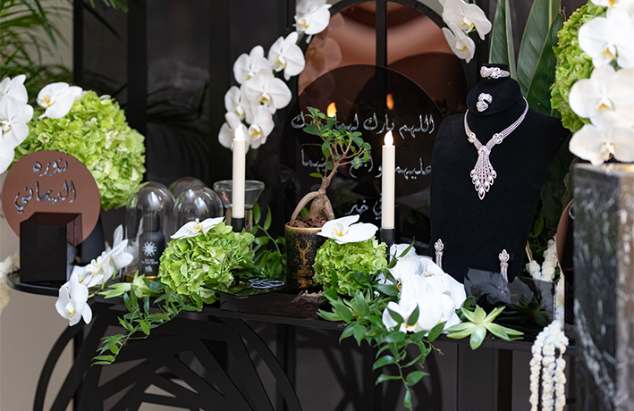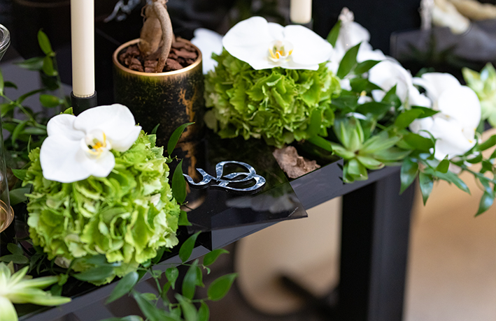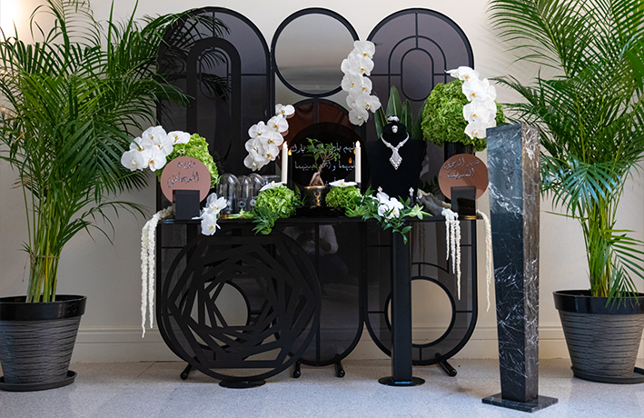 • طاولة باللون الأسود ‏منسقة بالورد الطبيعي وذلك حسب ذائقتكم.