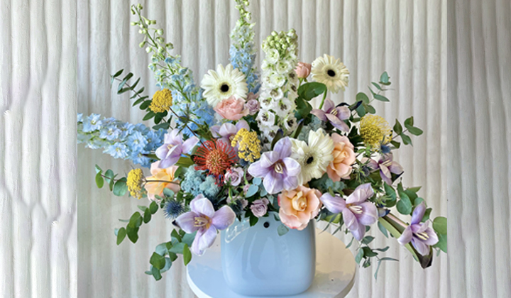 - فازة زجاجية مودرن منسقة بالزهور الطبيعية والجافة .