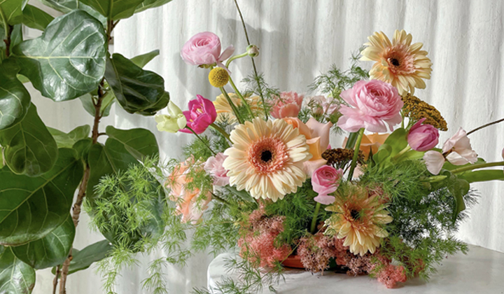 • قطعة مركزية موضوعة داخل طبق بلاستيكي ومغطاة بالعشب الأخضر ، ومنسقة بالزهور الجافة والنضرة .
