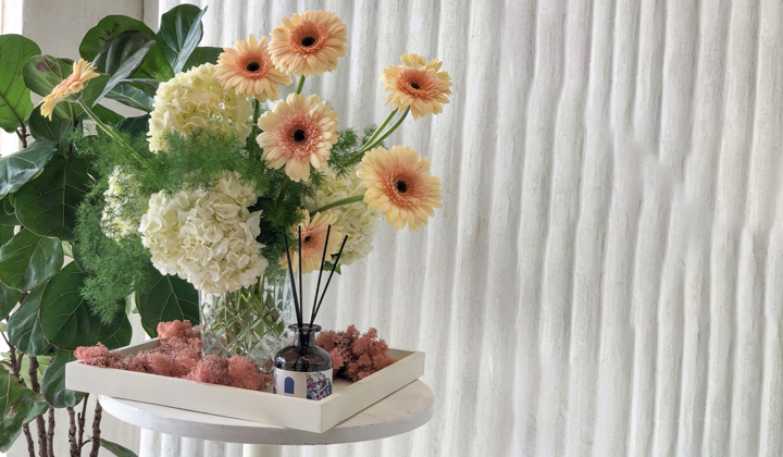 • صينية خشبية منسقة بالزهور الجافة والنضرة .