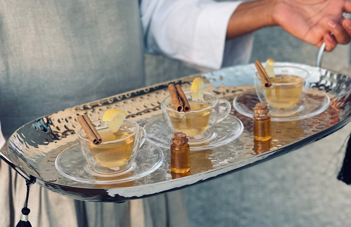 - عدد ٤ أنواع شاي: أسود بالهيل والزعفران والورد الدمشقي(يقدم مع منقوع الزعفران) ، أخضر مع ياسمين ، زنجبيل وليمون (يقدم مع قطع الليمون ، أعواد الدارسين ، وقراش العسل) ، شاي مغربي