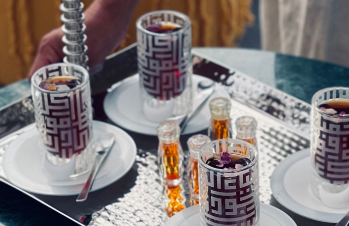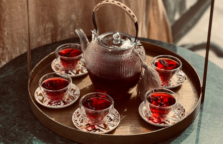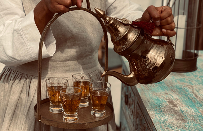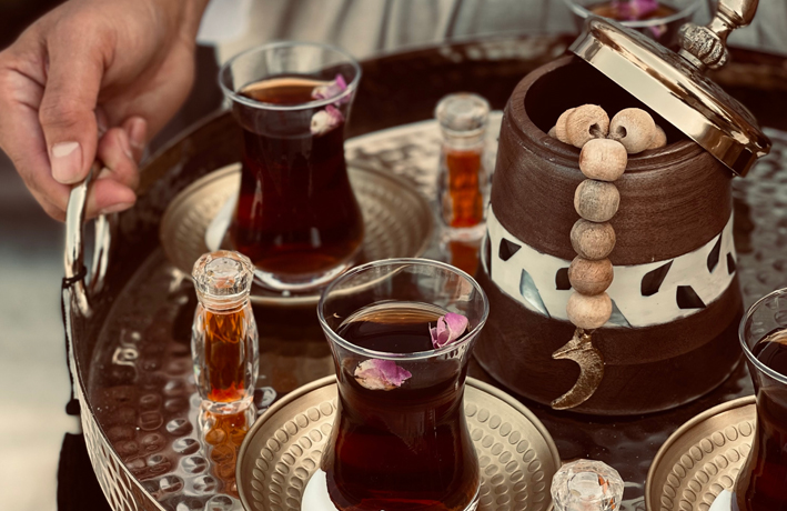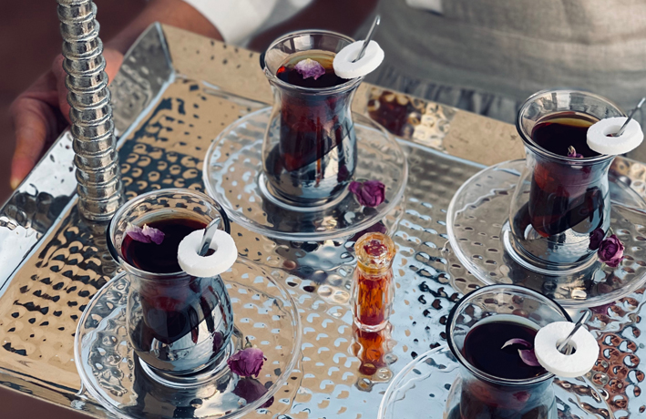 - عدد ٤ أنواع شاي : أسود بالهيل والزعفران ( يقدم مع منقوع الزعفران ، أخضر مع الياسمين ، كركديه ، شاي مغربي يقدم مع الأبريق والأكواب المغربية