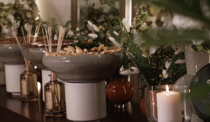 - طاولة خشبية يتم تنسيقها بالورد الصناعي ، الفازات