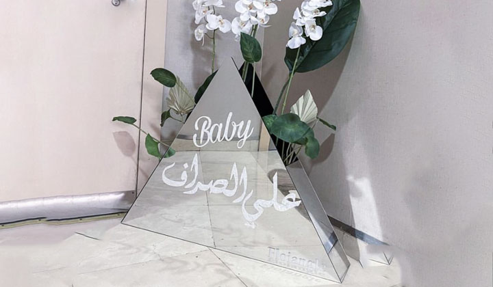 - ستاند وفازة مثلثة الشكل مصنوعة من المرايا يكتب عليها اسم المولود أو الأحرف ومزينة بالورد .
